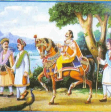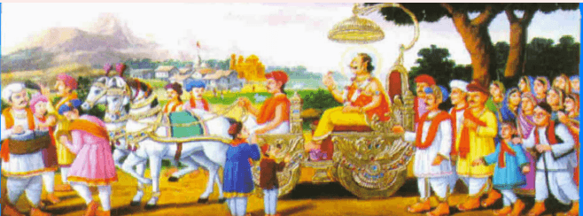 A painting depicting the scene in Samvat 1678, when after celebrating the festival of Shree Thakorji, Shree-mad Gokul came via the jungles of Surka in Shihor State, Shree-madh came from Gokul to keep the promise of Rajmata Param Bhagvadiya Shree Meghajee-ba of Shihor Pargana.