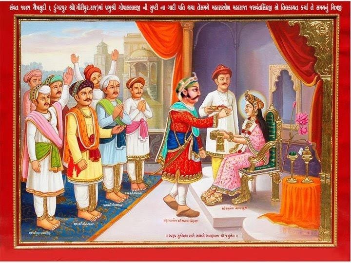 Maha-raol Param Bhagvadiya Shree Jaswantshinghji Maharaja Coronating Prabhu-Shree Gopal-lal as the heir of the Prabhu-Shree Jamunesh Maha-Prabhujee in Dungarpur together with the attendant Vaishnav-Vrund.